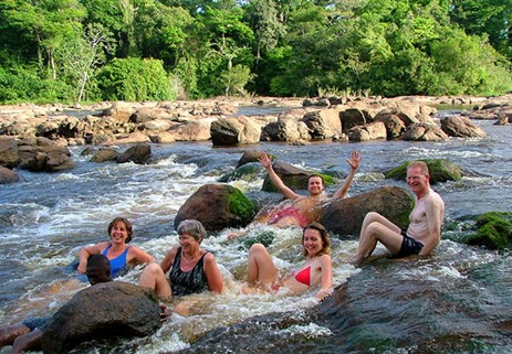 views. It is a treat to look for coolness in the Jaw Jaw rapids, surrounded by untouched nature. The resort has a large grass meadow and its own generator so that you have electricity between 7:00 pm and 7:00 am. The resort has telephone coverage and there is free Wi-Fi on the island.